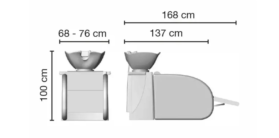 Backrest, seat and armrests in polyurethane foam on a wooden and metal structure. Skai upholstery of your choice. Fiberglass structure, white or black. Swinging ceramic basin with adjustable junction. Multipurpose trays. Optional legrest and/or vibrating massage.